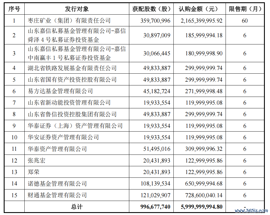 认购金额最大的为枣矿集团,获配约3.6亿股,认购金额约21.65亿元,限售期为60个月。其余14家投资者限售期均为6个月,涵盖公募基金、券商资管、山东国资、私募股权、个人投资者等。