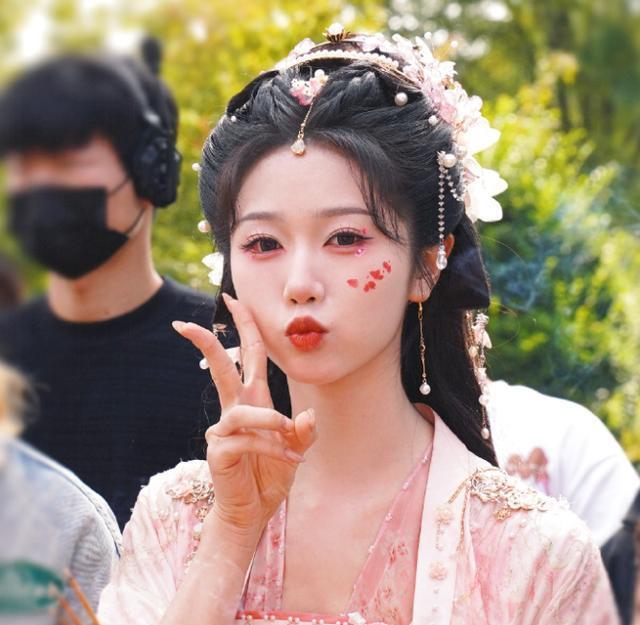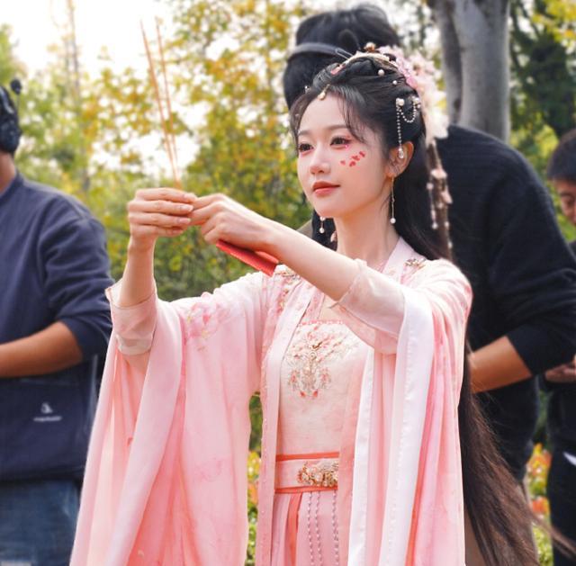 也许是受作品短剧《折腰》下架的影响,她的新角色桃夭的造型和从前差距很大,没有了露肩膀的风情感,而是一身粉衣尽显灵动。