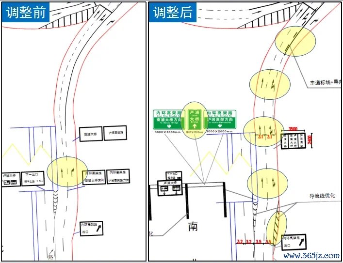 其一,调整出口匝道车道布置。南北高架西侧往鲁班立交转盘出口匝道为两车道,现状布置为直行和右转,本次将这两个车道调整为直行和直行+右转。增加进转盘车辆的蓄车空间,确保徐家汇路上匝道车辆能在不变更车道的情况下沿右侧车道直行通过鲁班立交转盘去往卢浦大桥。